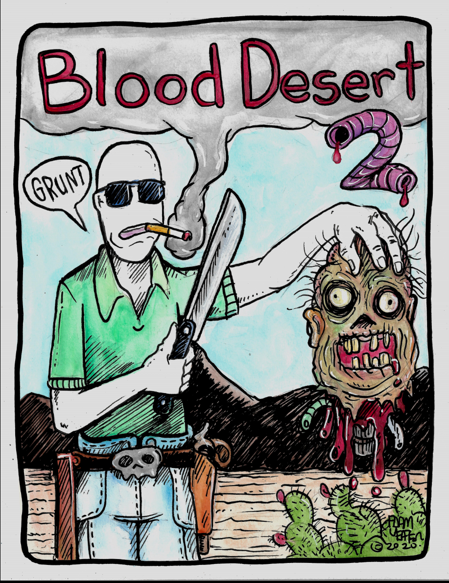 Issue 3 of the insane new horror gore series Blood Desert by Adam Yeater. Each book get progressively more sinister and action packed. This is strip down comics. No long winded prose or 1980s TV style dialogue. This is comix with Geuvos! This professionally printed 36 page magazine features a colored cover with black and white interiors.