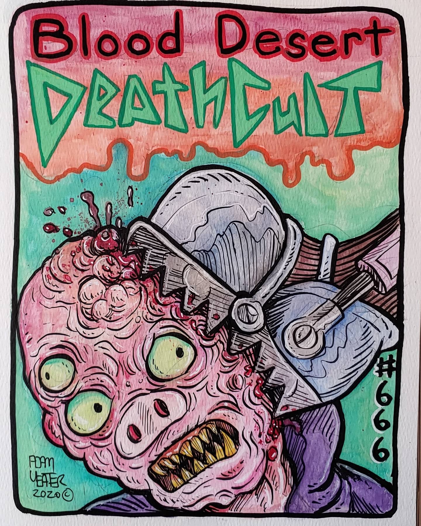 Blood Desert- Death Cult is issue 6 of my insane horror gore series. This magazine sized 48 page comic book is professionally printed. Color cover with black and white interiors. Ships with free mini comic and sticker.
